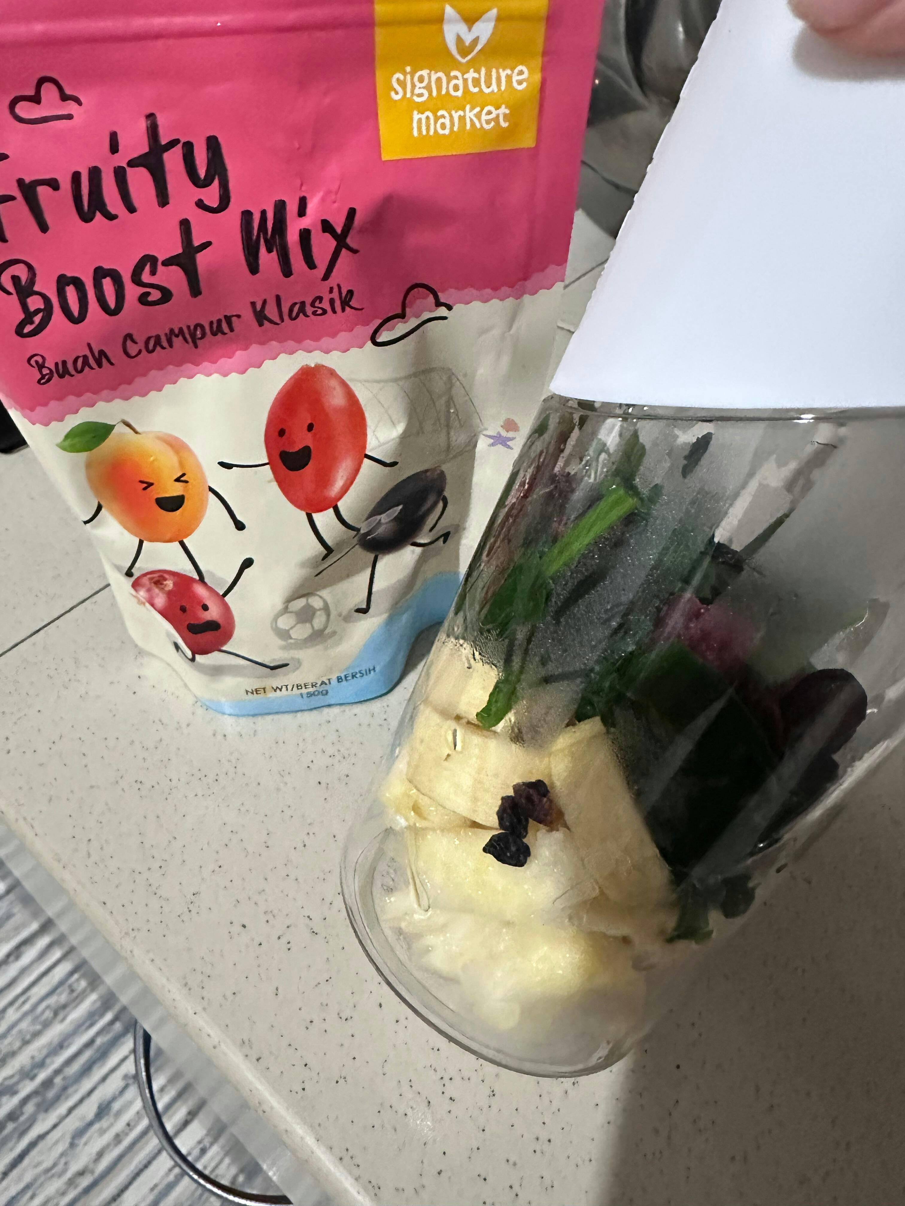 Blended with hiblendr mixed berries C-booster with almond milk, yogurt and oats. Voila, it's ready to be consumed. Easy easy, no more cutting fruits and washing is a breeze too. No risk of cuts from the blades.